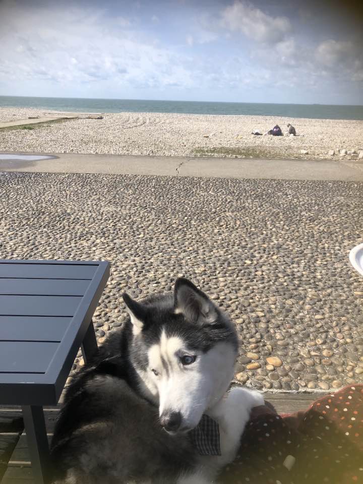 Tuesday the 16th of April, I sat at an empty picnic table. It was a windy cold day and the few patrons that had been at the lake, left. I cooked my dinner on my little cooker that I had purchased in Havre, France. It worked very well, but the wind was so fierce that it took the heat away from the pan. I used the case to make a barrier preventing the wind from blowing through. It worked and I was able to heat up my tv-dinner. The premade dinners I bought, did not need to be stored in the refrigerator or freezer, which was very convenient. The food started to smell good, and Ace was at my feet wanting me to share.
